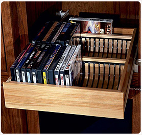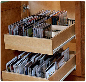 Wall pantry pull-out cabinets can be used in any room in the home. Here they are used for CD and DVD storage. Easily pulls out for easy access.